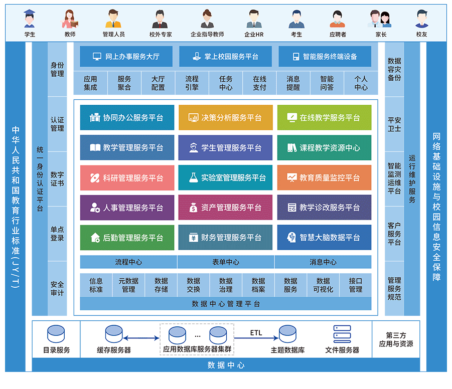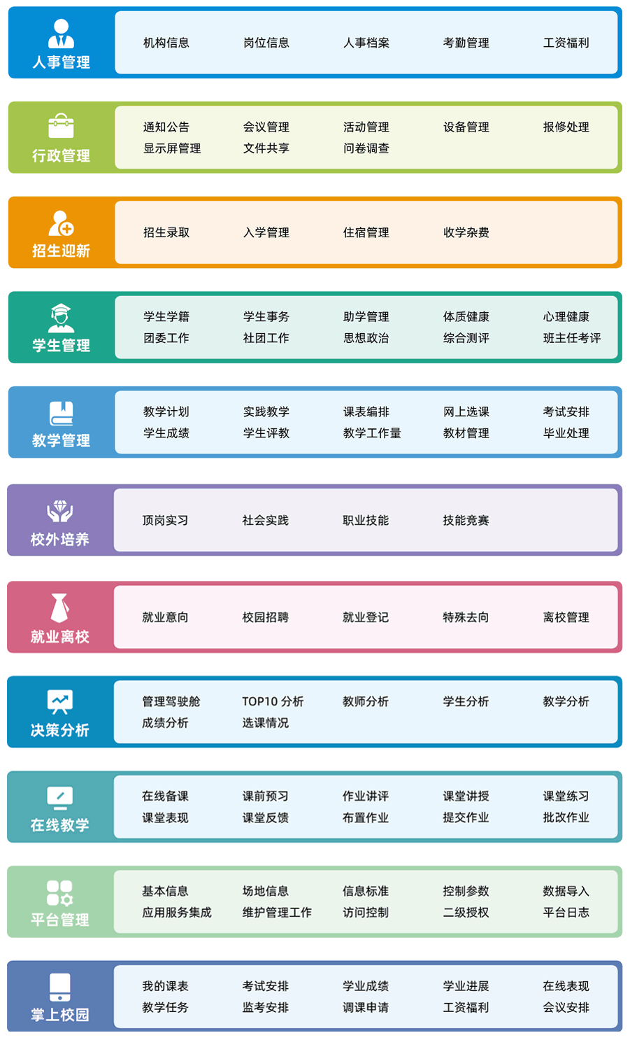 遵循一体化、组件化、智能化、移动化的指导思想,应用校园服务总线与微服务的技术架构方式集成人事管理、行政管理、学生管理、教学管理等各项业务,依托中国电信“天翼云”构建安全、可靠、可扩展、免维护的hth网页版云平台,通过SaaS模式为众多中职学校广大师生提供简便、快捷的综合信息服务,具有互联网特性、多租户特性、服务特性、可扩展特性。