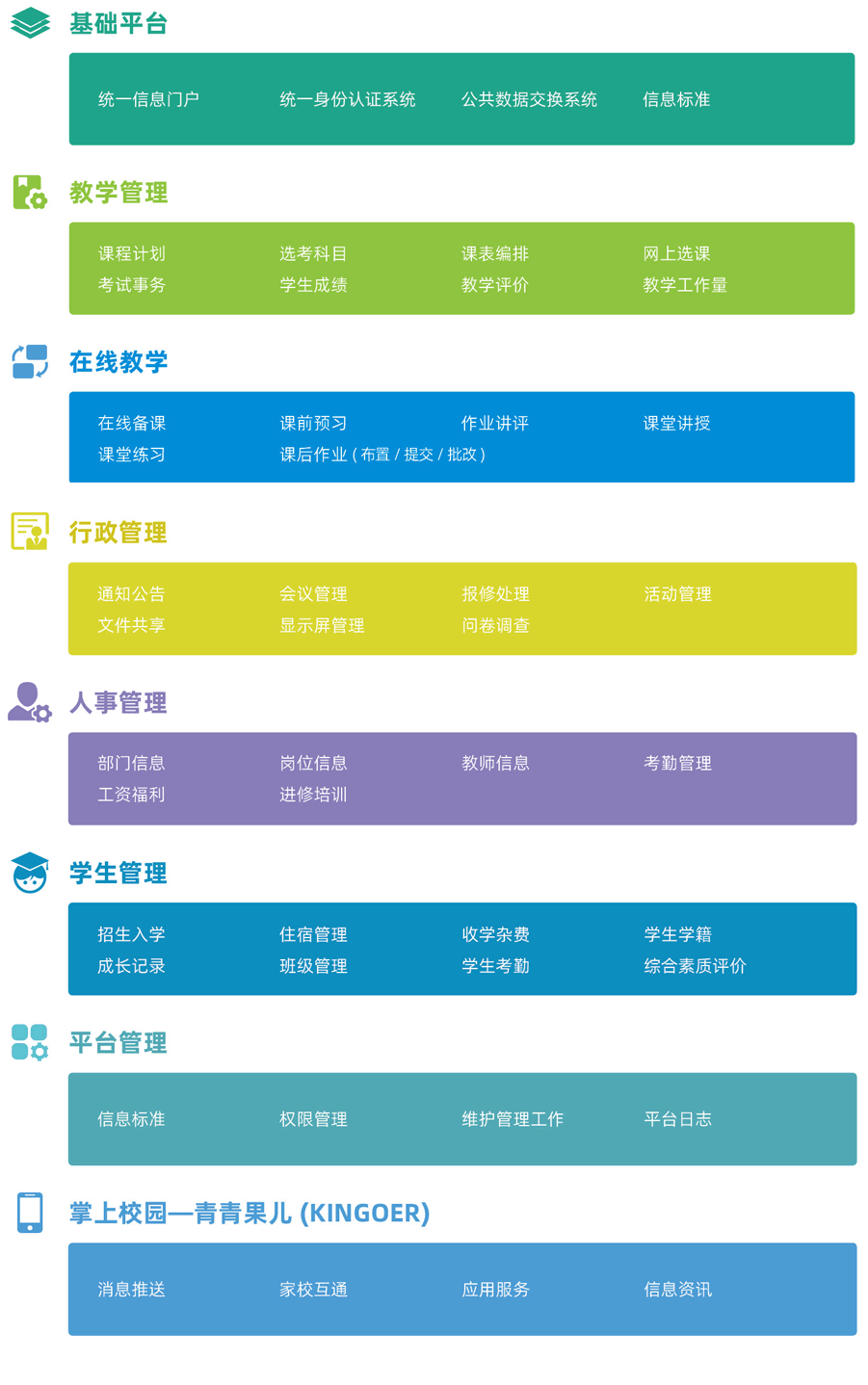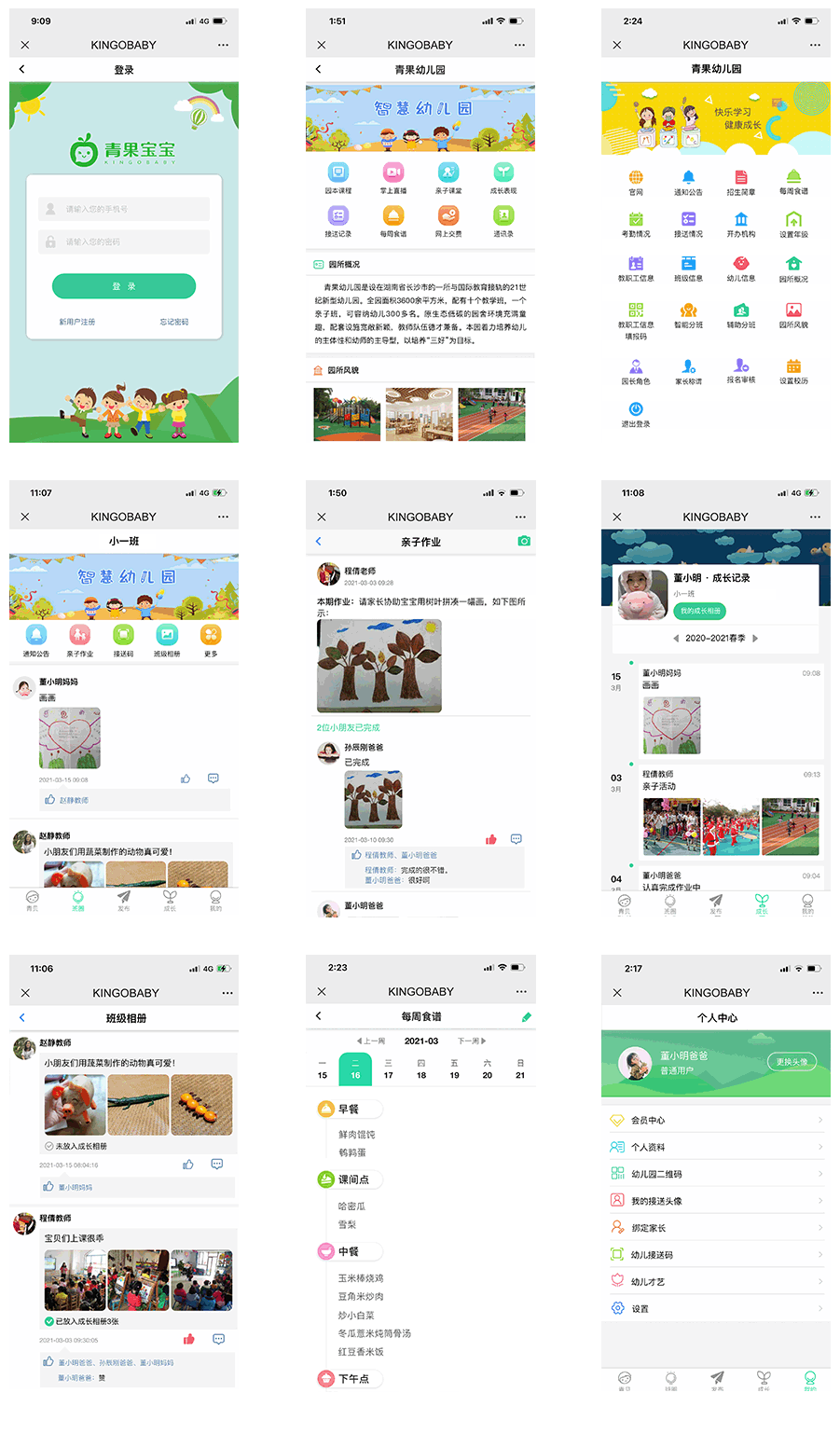 为幼儿园提供园务管理 ( 通知公告·教学安排·每周食谱·成长表现·亲子作业·班级相册·网上缴费·掌上直播·名师授课·教师考勤·幼儿接送 )、门户宣传 ( 园所风貌·幼师风采·幼儿才艺·活动报道·招生报名 )、家园互动服务;